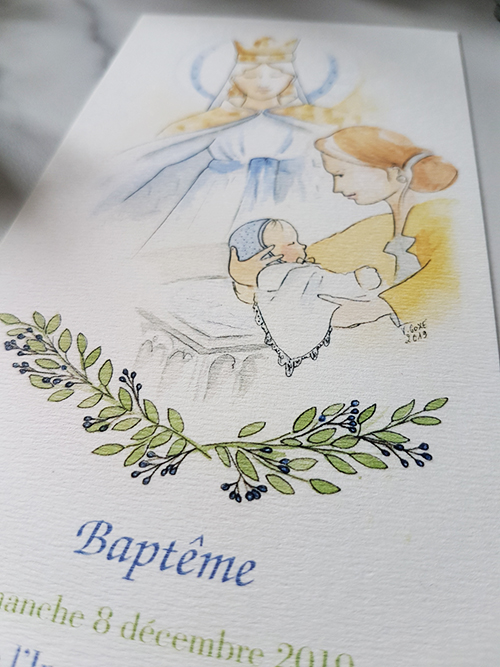 Toute la famille attend avec impatience la venue du petit frère, mais le projet se fera en secret pour garder la surprise jusqu’au bout. L’illustration principale du verso associe des bleus et des verts tendres, elle met en avant cette jolie fratrie de 8 enfants. L’adresse des propriétaires est associée à la silhouette discrète de leur magnifique maison et finalise le recto de ce faire-part. Le dessin du carton d’invitation du baptême reflète avec douceur, simplicité et pureté l’engagement religieux de la maman. La typographie a été choisie en vert et bleu pour s’harmoniser avec les teintes principales de l’aquarelle.