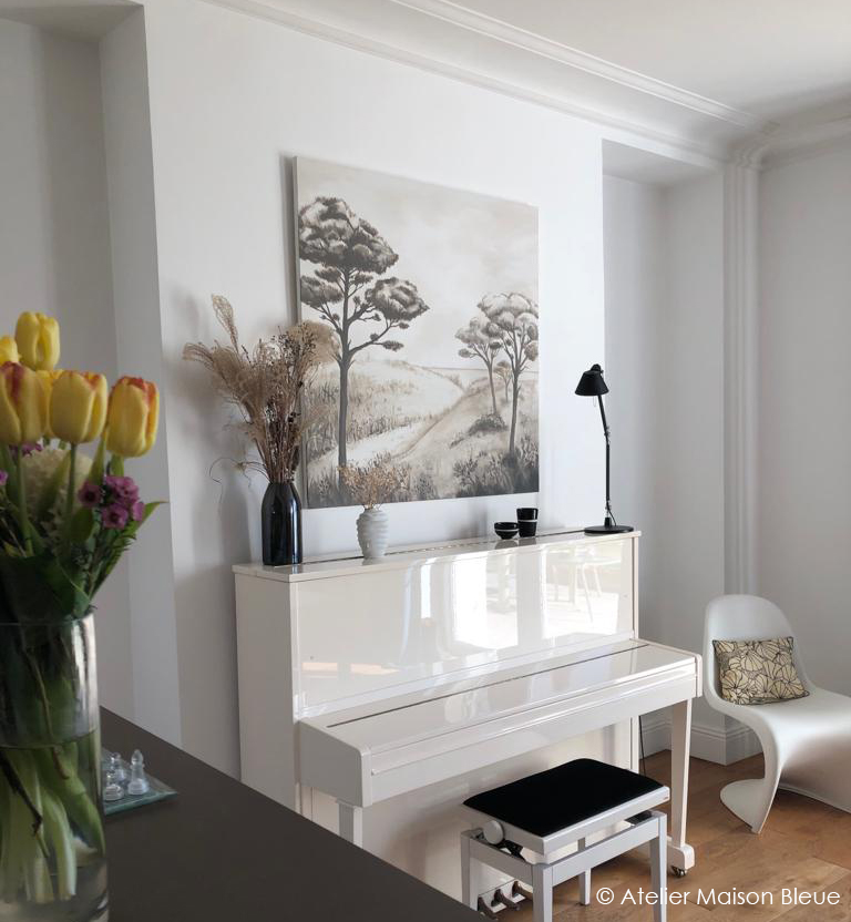 Cette toile d’1m/1m peinte à l’acrylique est disposée au-dessus de ce piano. Elle permet ainsi de créer une fenêtre imaginaire d’évasion vers un paysage de bord de mer. Ce chemin à travers les dunes crée une perspective et apporte de la profondeur à la pièce. La décoration actuelle aux teintes douces de chêne clair et de blanc a défini le choix des couleurs neutres du tableau permettant ainsi la possibilité de mettre des rideaux de couleurs plus vives.